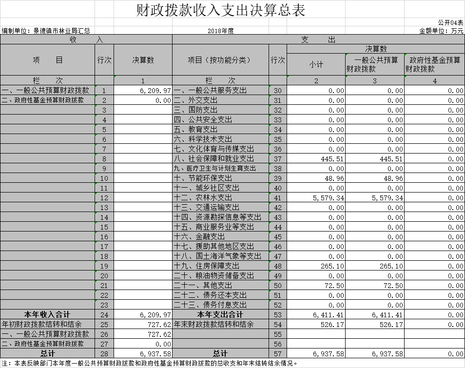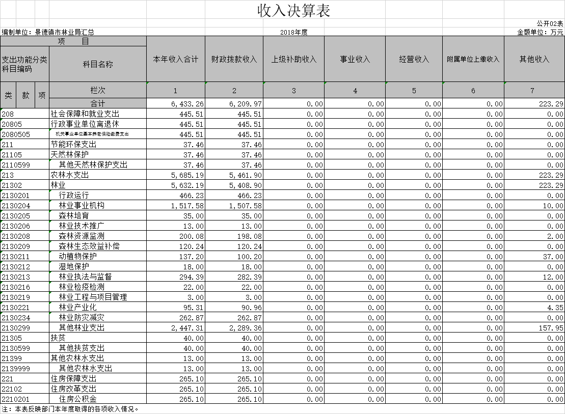 本部门2018年度收入总计7184.75万元,其中年初结转和结余727.62万元,较2017年减少2512.49万元,下降25.91%;本年收入合计6433.26万元,较2017年减少2045.08万元,下降24.12 %,主要原因是:枫树山林场的财政拨款比上年减少,其他收入(经营收入)比上年减少近2000万元。