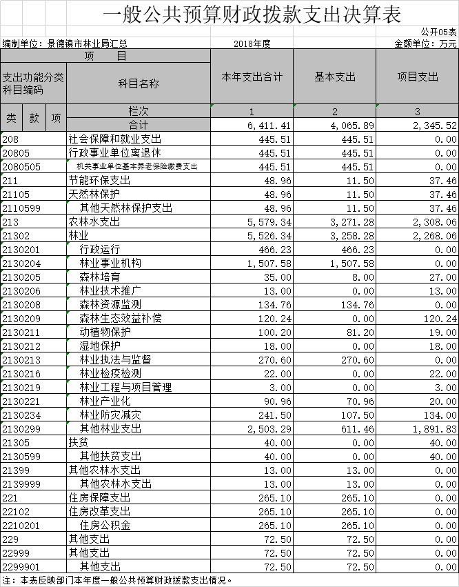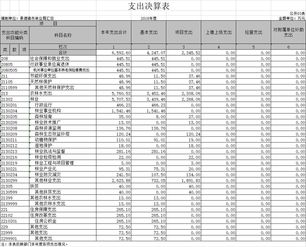 本部门2018年度支出总计7184.75万元,其中本年支出合计6592.6万元,较2017年减少2245.85万元,下降25.41 %,主要原因是:枫树山林场的收入减少相应的支出也减少;年末结转和结余727.62万元,较2017年减少369.58万元,下降33.68 %,主要原因是:局本级的本年支出大于本年收入。