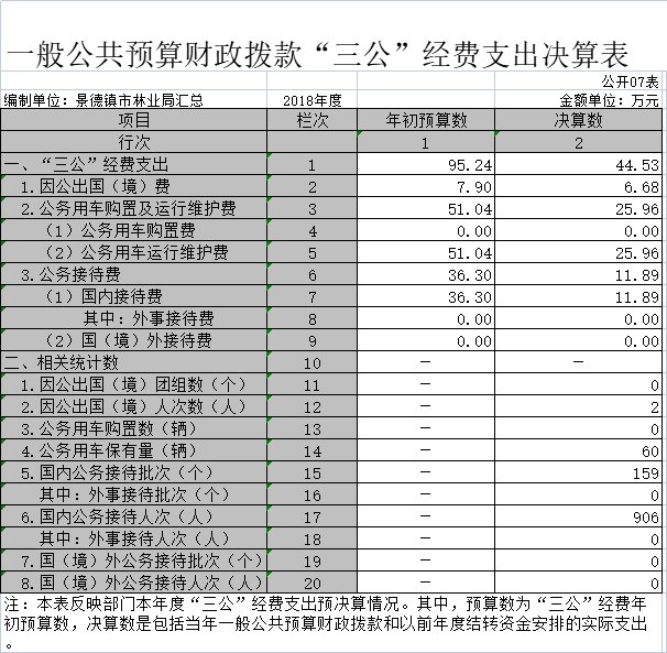 (四)三公经费:反映财政拨款安排的因公出国(境)费、公务用车购置及运行费和公务接待费。其中,因公出国(境)费反映单位公务出国(境)的国际旅费、国外城市交通费、住宿费、伙食费、培训费、公杂费等支出;公务用车购置及运行费反映单位公务车辆购置支出(含车辆购置税)及租用费、燃料费、维修费、过桥过路费、保险费、安全奖励费用等支出;公务接待费反映单位按规定开支的各类公务接待(含外宾接待)支出。
