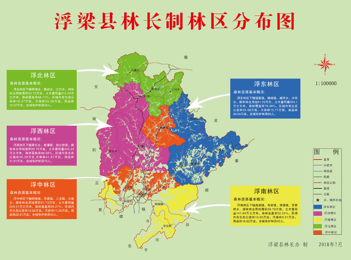 浮梁设立林区建了组织体系。为充分落实保护发展森林资源目标责任制中的政府主体责任,浮梁县没有按照一名县级林长负责一个乡镇的模式设立林长,而是将全县324万亩山林根据历史沿革、山形走势、生态功能等因素区划为7大林区。县级设立总林长和副总林长分别由县党政主要领导担任,县政府7名副县长各负责一个林区,担任林区长。乡镇同样也是将3-4个村划为一个片,每个乡级副林长负责一个片。村级由党组织书记任林长,村委会主任任副林长。围绕五大林区,按照“党政同责、划区管理、分级负责”的原则,形成了以三级书记任林长的组织体系。